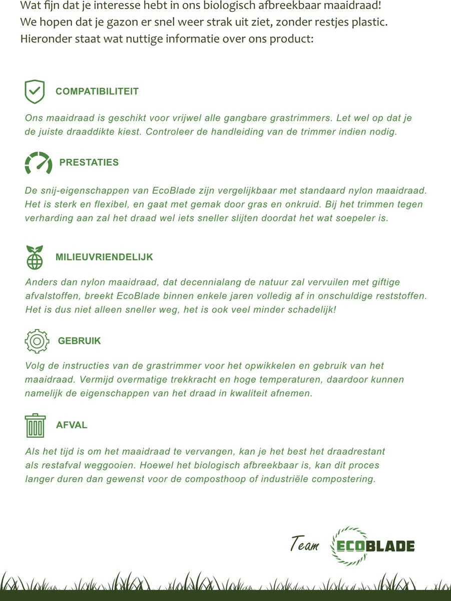 Le fil de coupe est consommé lors de l’utilisation d’un coupe-herbe. Avec le fil de nylon, cela finit dans votre jardin sous forme de (micro)déchets plastiques, et met environ 50 ans à se décomposer tout en libérant lentement des substances toxiques ! EcoBlade est entièrement biodégradable et se décompose dans la nature en substances inoffensives telles que l’eau, le dioxyde de carbone et la biomasse. Selon la taille des morceaux résiduels, cela prend entre quelques semaines et environ 2 ans.