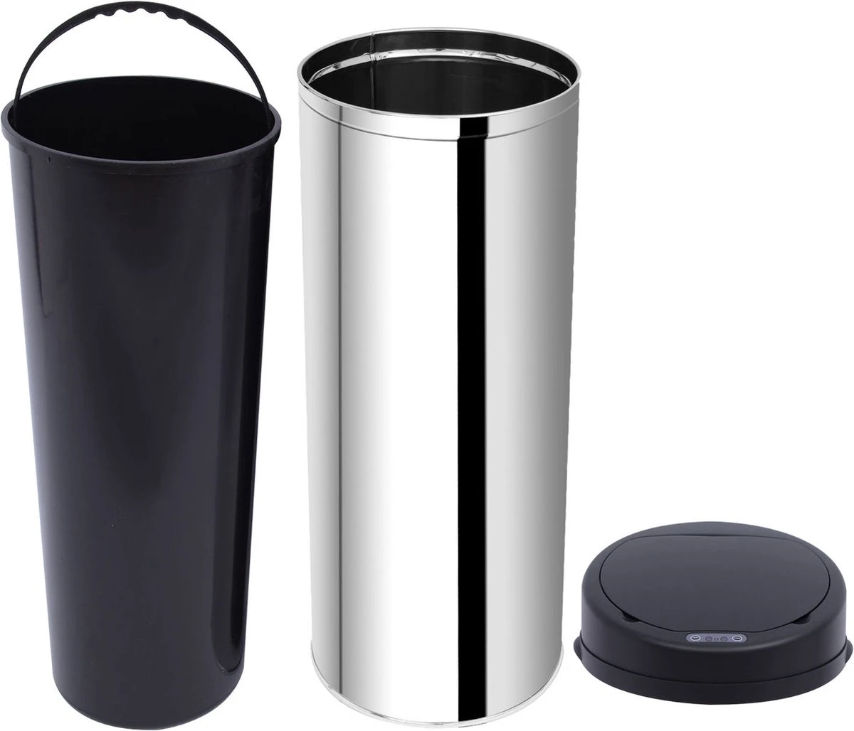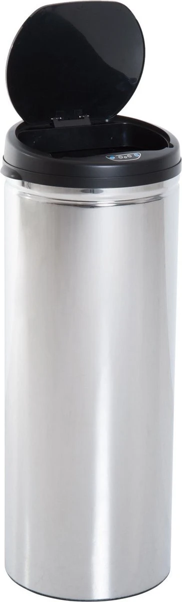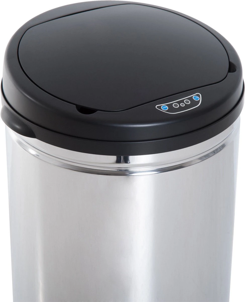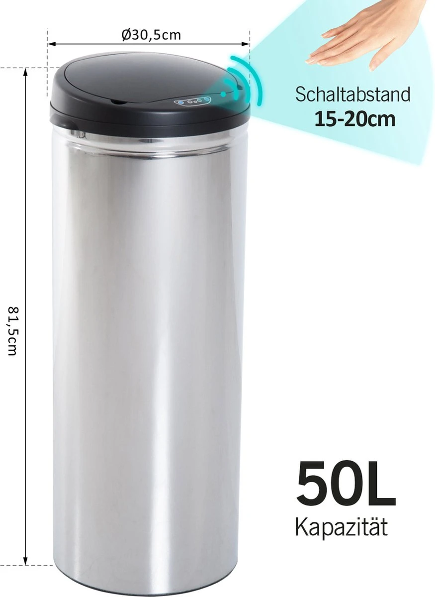 Capacité : 50 l Technologie de capteur : infrarouge Dimensions d’encombrement : Ø 30,5 x H 81 cm Couvercle : ABS Boîtier : acier inoxydable, hautement poli Seau intérieur : PP Nécessite 4 piles AA (non fournies) Poids : 3,9 kg