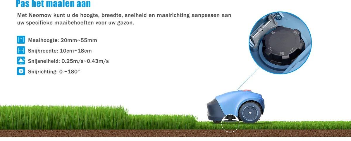 Hauteur de coupe réglable : Avec la Neomow S , vous pouvez régler la hauteur de coupe de 20 mm à 55 mm avec une largeur de coupe de 18 cm. Vous pouvez le régler manuellement et la Neomow S tondra avec précision.