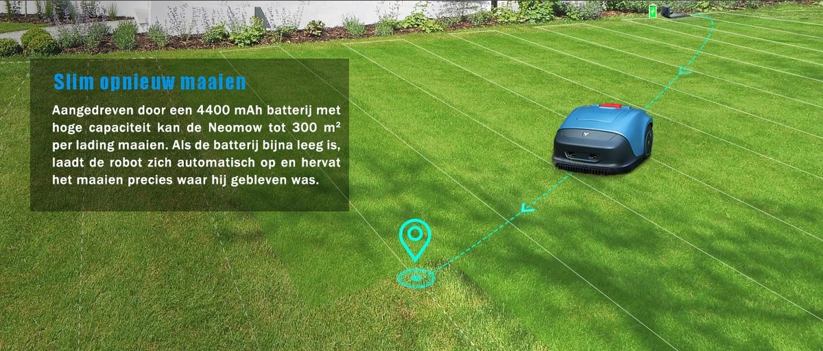 Recoupe intelligente à l’arrêt : La Neomow S est alimentée par une batterie grande capacité de 4400 mAh et peut300㎡ tonte par charge. Il revient astucieusement au dock lorsque la batterie est faible. Il reprend ensuite la tonte exactement là où il s’était arrêté après une charge complète, assurant une couverture continue de votre pelouse sans interruption.