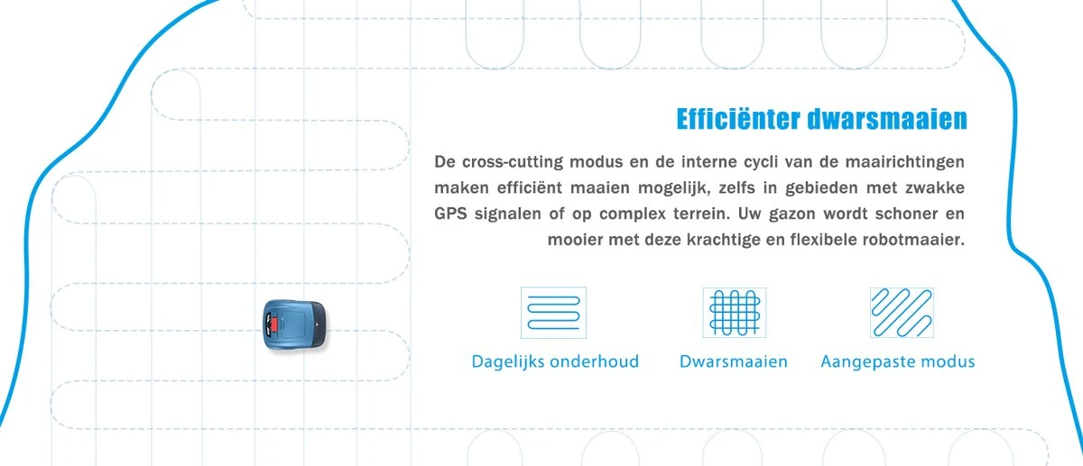 Tonte transversale, plus efficace : Grâce aux différentes positions de coupe, vous pouvez parfaitement tondre avec moins de points manqués. Le mode de tonte croisée et le cycle directionnel interne permettent une tonte efficace même dans les zones avec un signal GPS faible ou un terrain complexe. Puissante et flexible, votre pelouse sera beaucoup plus nette et plus belle.