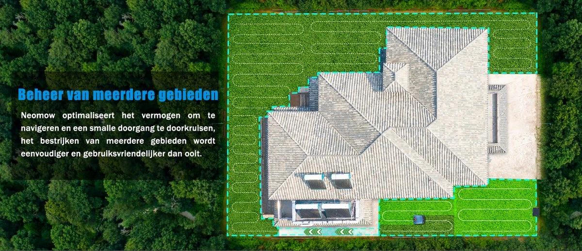 Activer la tonte multizone : Neomow S optimise la capacité de naviguer et de traverser un passage étroit, avec la fonction de retour Smart à la station de batterie, la tonte multizone devient plus facile et plus conviviale que jamais.