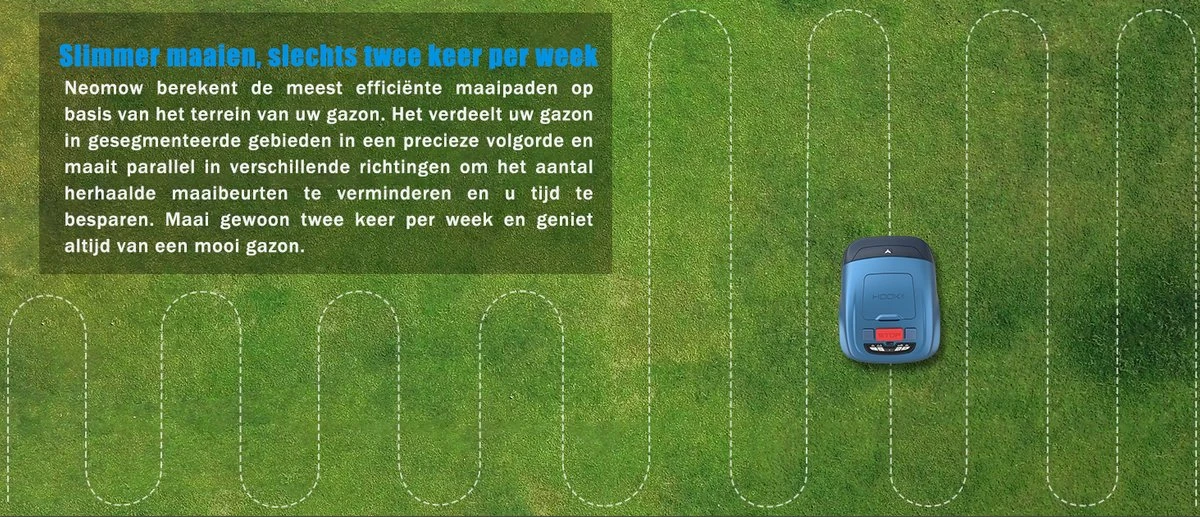 Une tonte plus intelligente, seulement deux fois par semaine : contrairement aux robots tondeuses traditionnels qui tondent de manière aléatoire, le Neomow S calcule des trajectoires de tonte efficaces en fonction de la taille, de la forme et du terrain de votre pelouse. Il divise votre pelouse de manière séquentielle avec précision en zones segmentées et tond en parallèle dans différentes directions pour réduire les tontes répétées et gagner du temps. Vous n’avez besoin de tondre que deux fois par semaine et vous profitez toujours d’une belle pelouse.