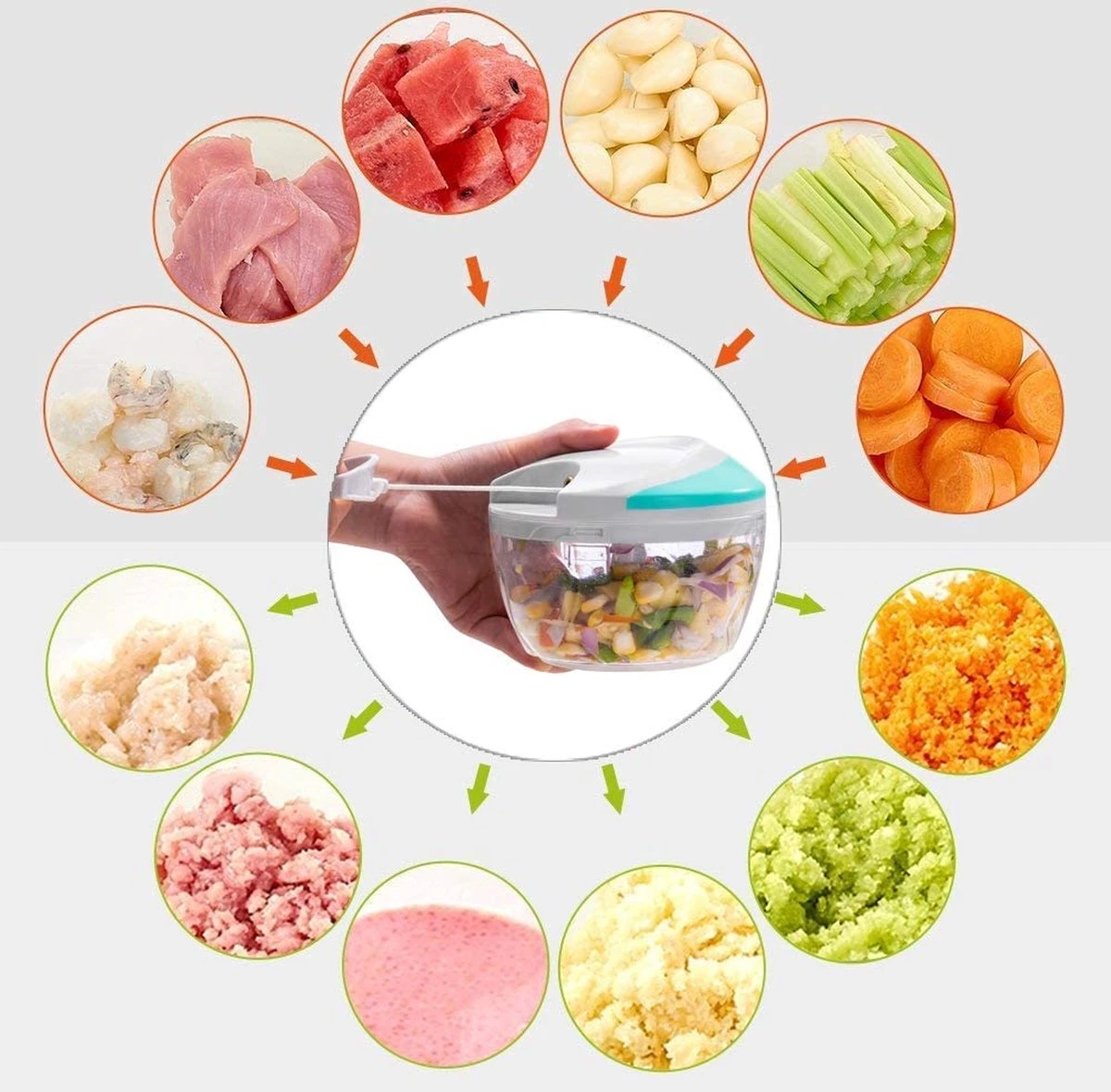 - FONCTIONNEMENT SANS ÉLECTRICITÉ MAIS FACILE À UTILISER : Il suffit de placer les ingrédients dans le récipient, de mettre le couvercle, de tourner et de verrouiller le couvercle et enfin de tirer sur le côté. Plus vous tirez sur le cordon, plus vous obtenez de petits morceaux. Vous pouvez contrôler la nourriture pour devenir ce que vous voulez.
