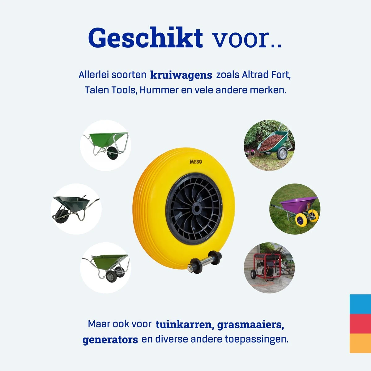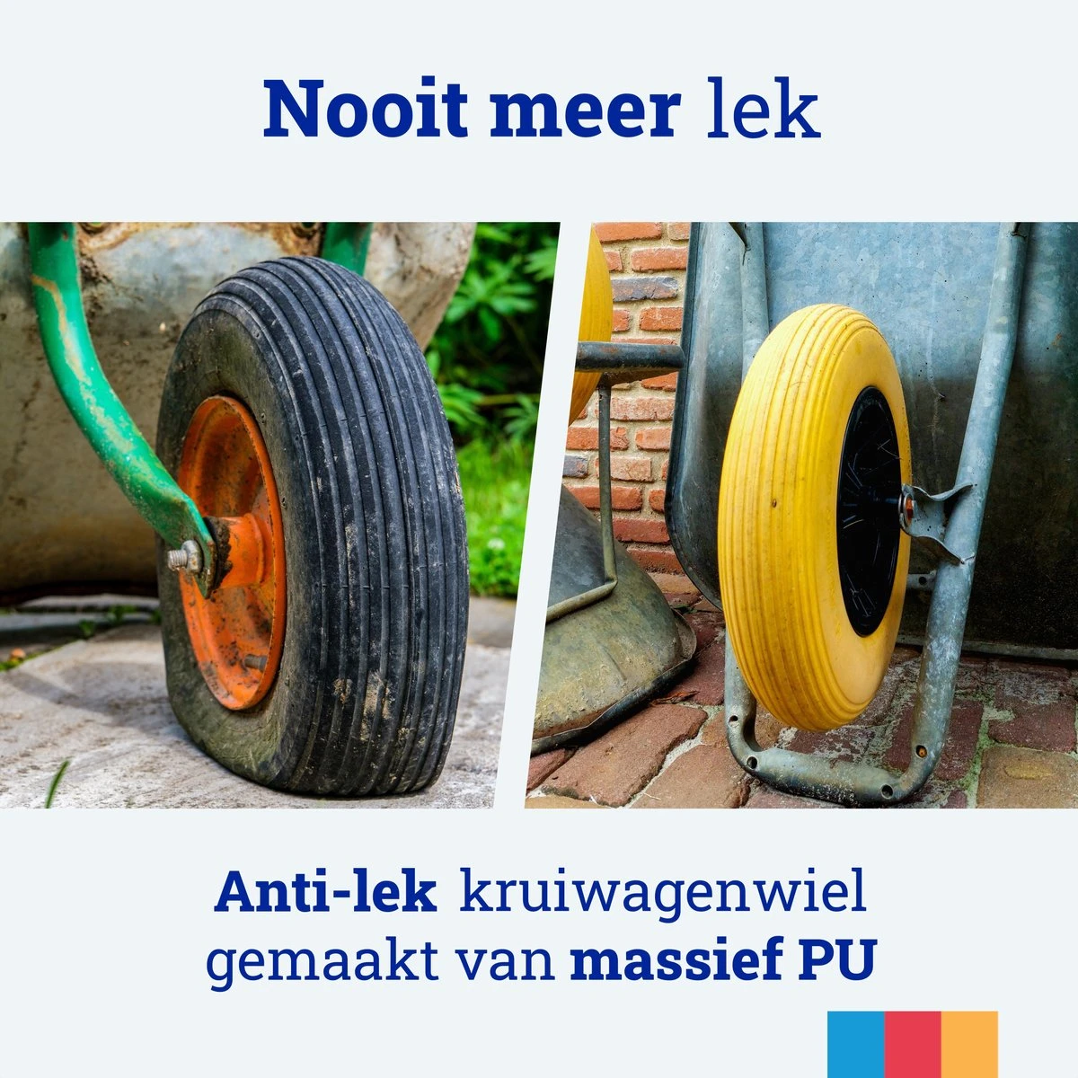 En choisissant des roues de brouette en PU solide, aucune fuite ne peut se produire. Cela signifie que vous n’avez pas Ă remplacer ou Ă gonfler la roue aussi souvent.