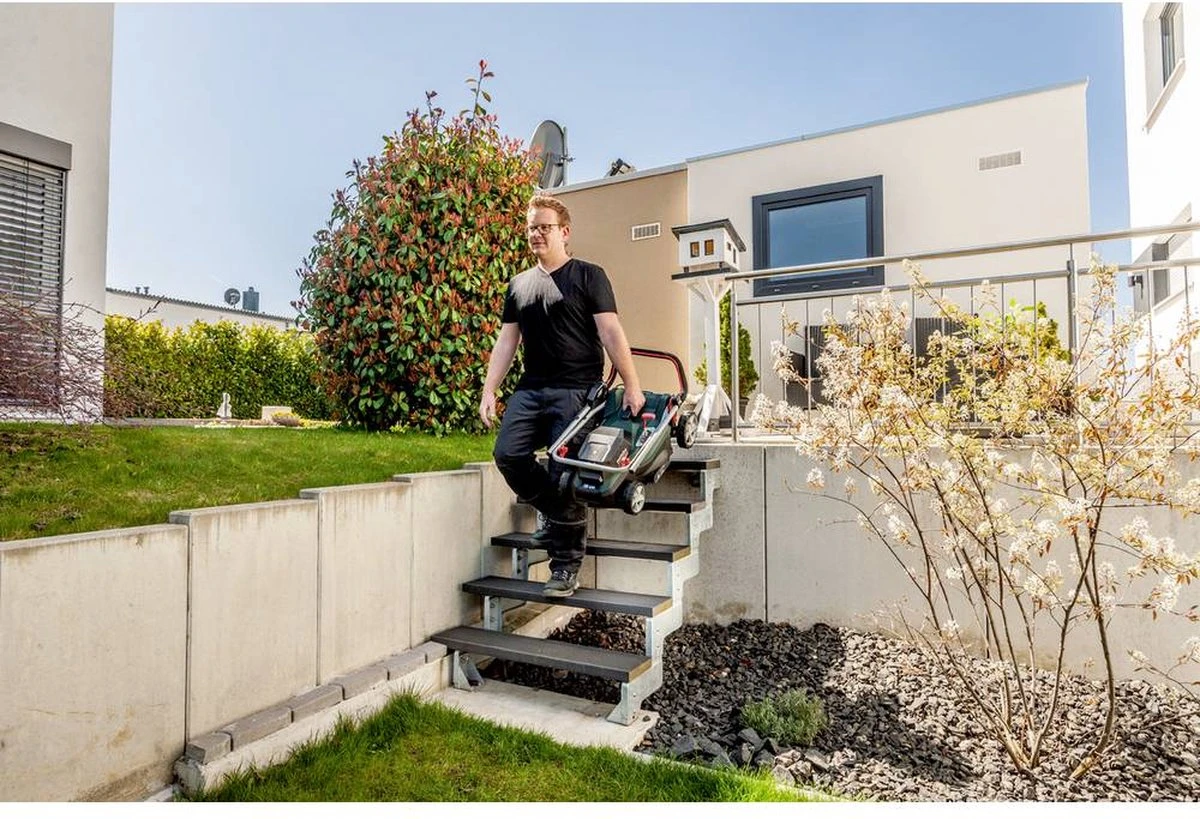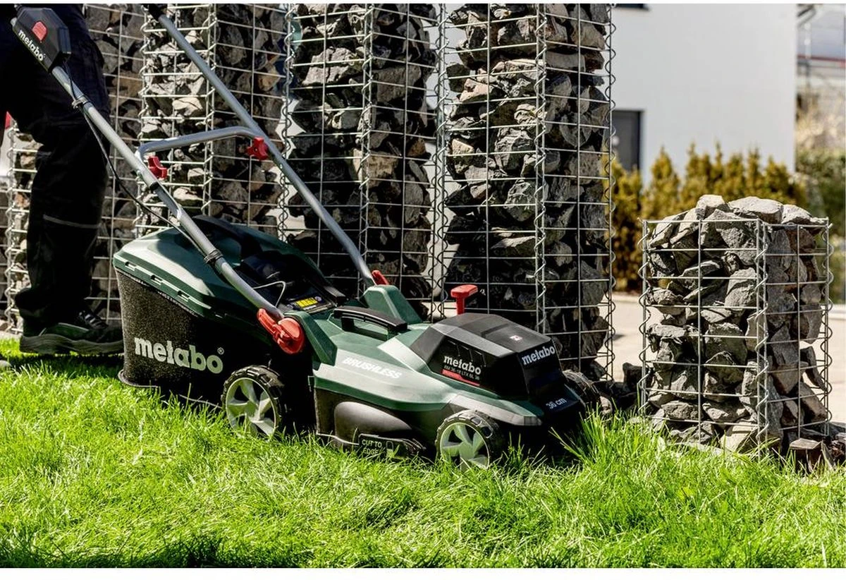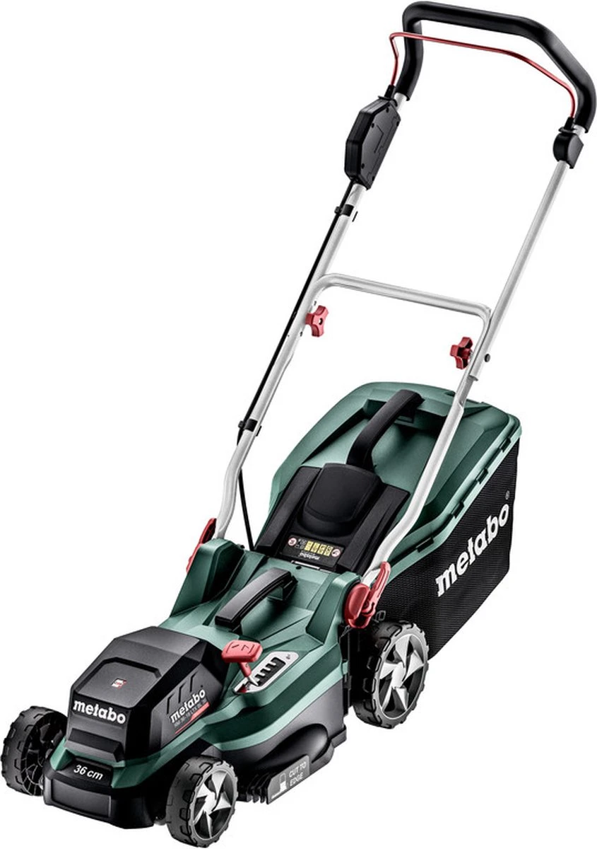 Tondeuse à gazon à batterie Metabo RM 36-18 LTX BL 36 Sans batterie 18 V Largeur de coupe maxi 36 cm Tondeuse à gazon à batterie compacte et maniable pour la tonte et le mulching de surfaces jusqu’à 350 m2 Le matériau de coupe est collecté soit dans le sac collecteur flexible, soit directement sur le surface verte couverte Moteur sans balais puissant pour des performances de coupe élevées et une longue durée de fonctionnement par charge de batterie Réglage centralisé et facile à utiliser de la hauteur de coupe en 5 étapes Bord étroit, coupe nette grâce à la lame de faucille de haute qualité et aux peignes à herbe intégrés Bouchon mulch Clé de sécurité Sans batterie, sans chargeur