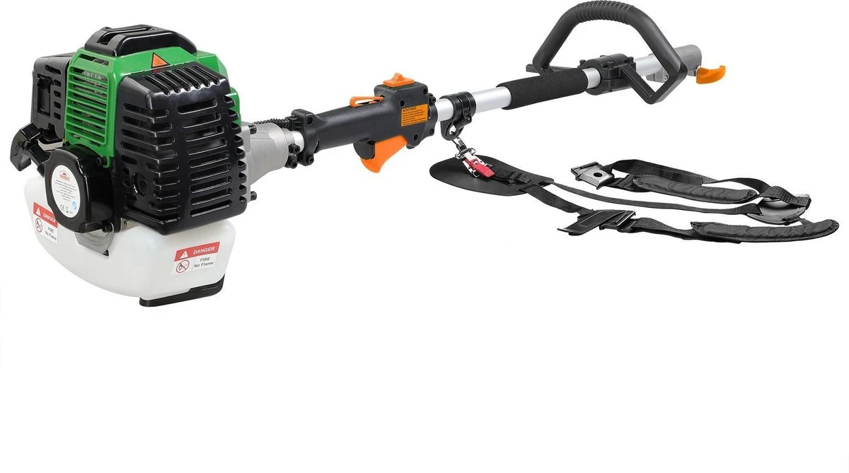 - 1 x outil de jardin multifonction à moteur à essence avec 5 accessoires différents, sangle de transport et outils de maintenance