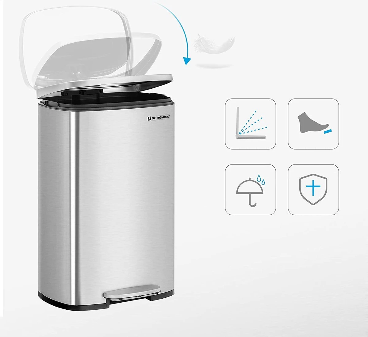 •Montre également des pages souples : bien que cette poubelle ait un conteneur extérieur robuste, elle a également ses pages souples : grâce à l’amortisseur intégré, le couvercle ne se replie pas brusquement, mais se ferme lentement et silencieusement.