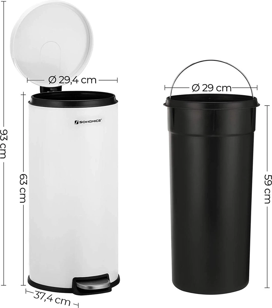 Ce que vous obtenez : Une poubelle de 30 litres avec pédale. Le couvercle à fermeture douce se ferme en douceur et avec précaution et protège des mauvaises odeurs ; le seau intérieur amovible facilite le nettoyage ; la poignée pratique facilite le déplacement