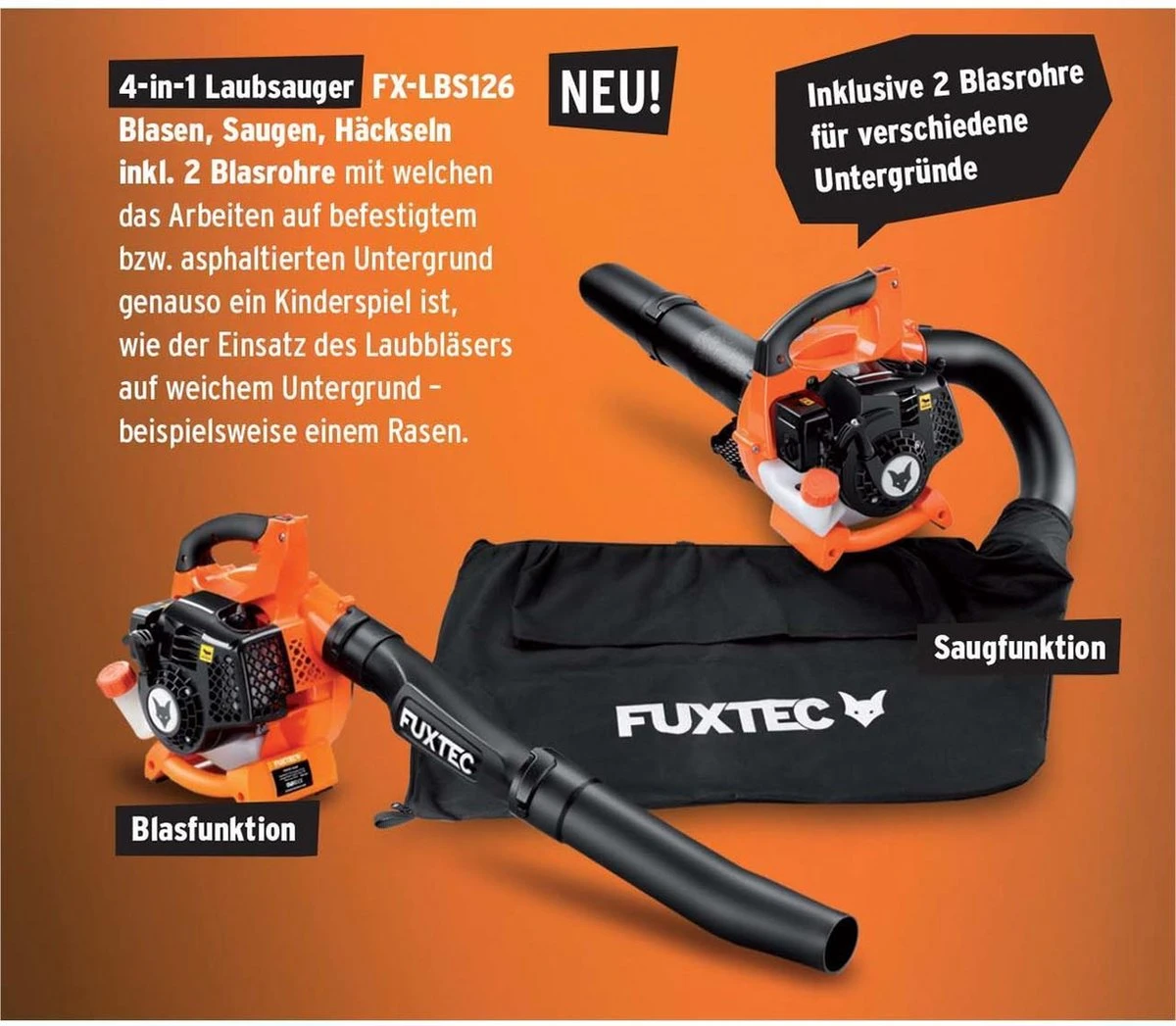 Souffleur à feuilles essence FUXTEC 4 en 1 Fonction soufflage – fonction aspirateur – fonction broyage – sac de ramassage Capacité : 26cc Mélange essence 1:40 71m/s vitesse d’air maximale Carburateur avec pompe primaire Grand sac de ramassage – 45 l Griffe de hachage en métal Massief Spécial à propos de cette feuille le ventilateur est la fonction de double soufflage. Les sarbacanes fournies, en versions droites et courbes, rendent le nettoyage sur sol pavé/asphalté aussi simple que d’utiliser le souffleur de feuilles sur sol meuble, par exemple sur une pelouse. Le chalumeau incurvé transporte la pression de l’air sous les matériaux, de sorte que, par exemple, les feuilles sont bien mieux soufflées les unes contre les autres. Le tuyau droit est utilisé sur un sol pavé, de sorte que la poussière, le gravier, etc. explosent moins et que votre surface soit toujours nettoyée. Un appareil extrêmement robuste et puissant, le FUXTEC LBS126 est parfait pour nettoyer de grandes surfaces et pour souffler l’herbe, les lits, les feuilles, le papier, etc. Cet appareil convient même comme aide pratique pour le déneigement; il suffit de souffler la neige loin des voitures, des trottoirs ou des allées. Le moteur puissant mais économique est équipé d’un grand réservoir (450 ml). Ceci, en combinaison avec le sac de collecte de 45 litres, garantit un travail long et efficace. Les poignées ergonomiques et le système anti-vibration promettent un travail confortable. Tout cela ne pose aucun problème avec le souffleur de feuilles FUXTEC. Remarque FUXTEC : Pour des performances optimales et durables de nos appareils, nous recommandons nos huiles FUXTEC d’origine – Made in Germany.