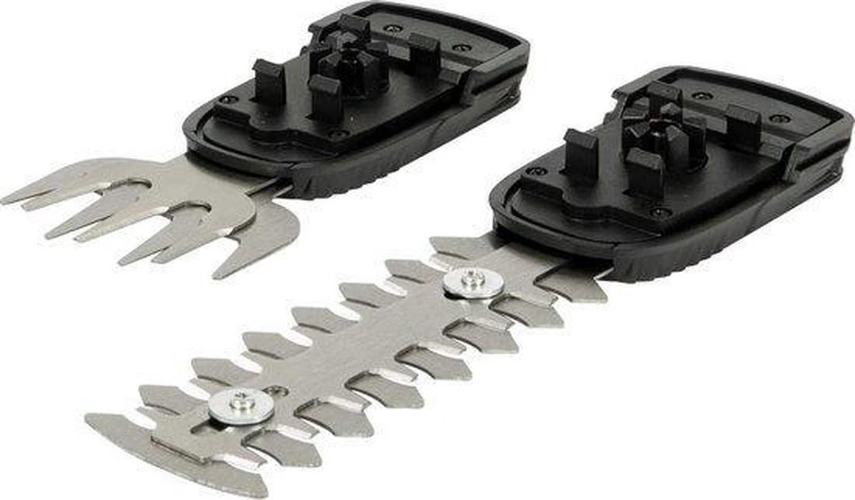 cisailles sans fil avec batterie intégrée avec lame de contour, lame d’arbuste et boîte de rangement.
