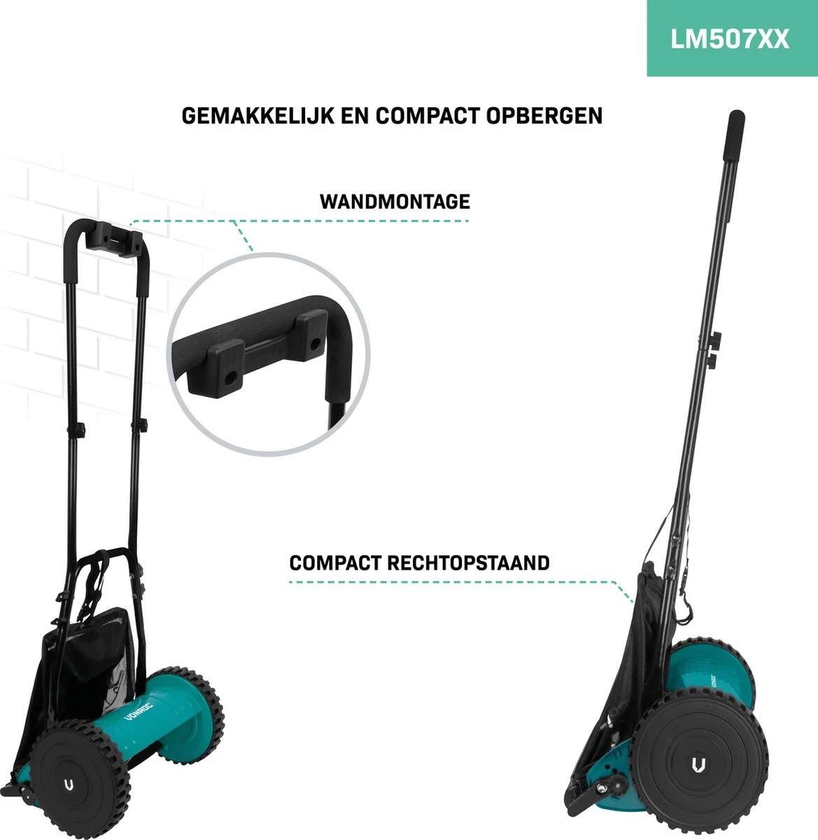 Tout comme vous prenez soin de votre pelouse avec amour, VONROC prend soin de ses machines avec amour. C’est pourquoi la poignée est équipée d’un Soft Grip doux pour une tonte plus confortable. De plus, la poignée est réglable pour que vous puissiez ranger la tondeuse de manière compacte. Vous préférez l’accrocher au mur ? C’est aussi possible; un support de suspension (avec kit de montage) est inclus, unique ! Un sac de collecte de 14 litres est également inclus afin que la plupart des coupures soient collectées immédiatement.