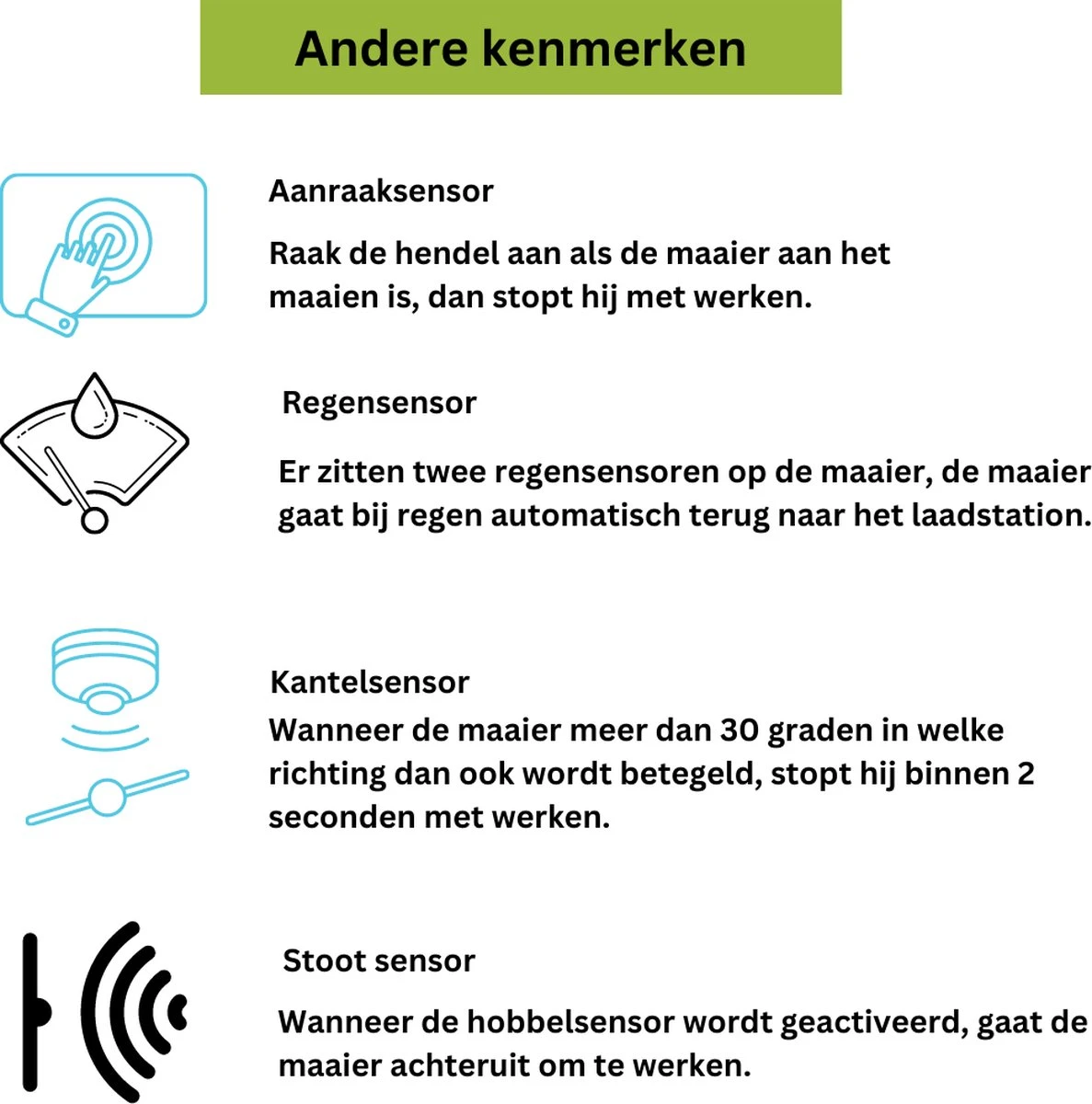 Il s’active lorsque la tondeuse heurte un objet solide et fixe lorsque cet objet est à au moins 6 cm de hauteur verticale de la surface d’appui de la tondeuse, lorsque le capteur de bosse est activé, la tondeuse recule pour travailler.